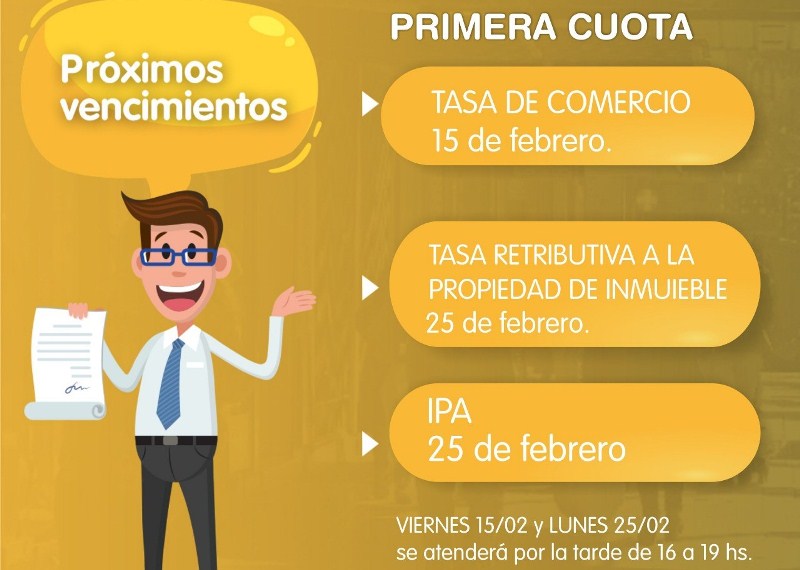 OBERÁ. El viernes 15 del corriente se producirá el vencimiento de la Tasa de Comercio. En tanto que se produjo la prórroga del vencimiento de la Tasa Retributiva a la Propiedad de Inmueble para el día 25 de febrero, misma fecha que vence el Impuesto al Parque Automotor (IPA). En ambas fechas, se atenderá por la tarde de 16 a 19.