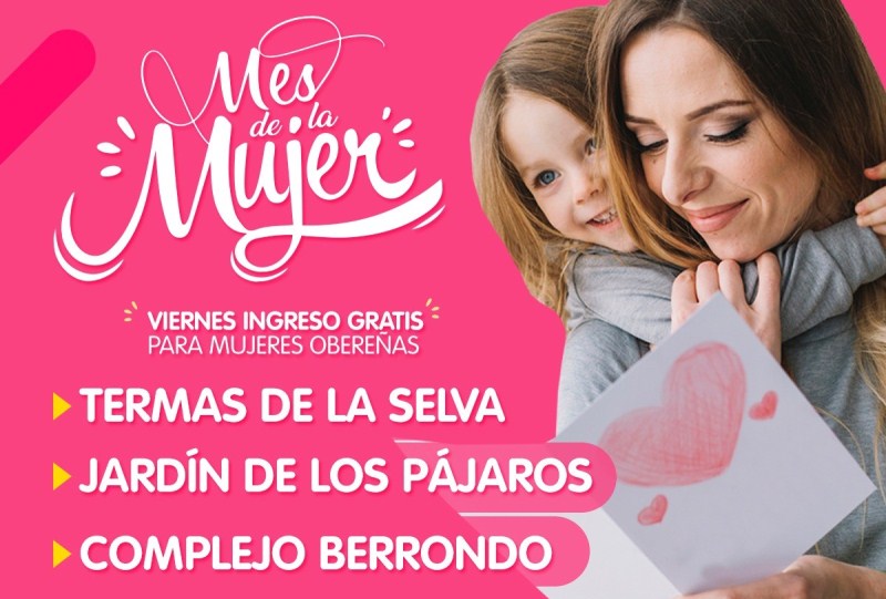 OBERÁ. Por celebrarse el Día Internacional de la Mujer, este viernes 8 de marzo, todas las OBEREÑAS, tendrán acceso libre y gratuito a Termas de la Selva, el Camping Salto Berrondo y Jardín de los Pájaros.
