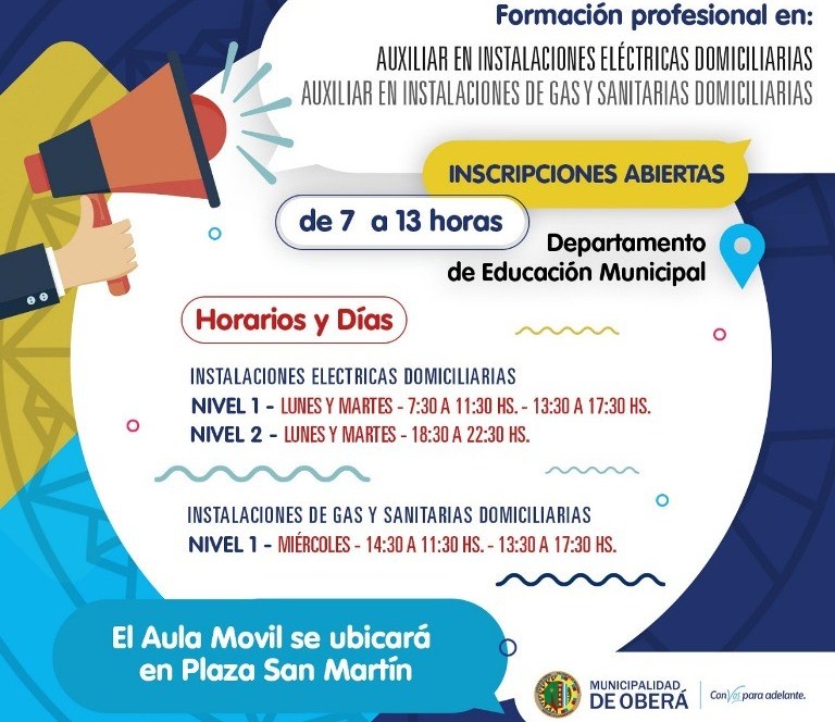 Las Aulas Talleres Móviles con cursos de auxiliar en Instalaciones Eléctricas Domiciliarias Nivel 1 y 2. Auxiliar en Instalaciones de Gas y Sanitarias Domiciliarias nivel 1 y 2. El nivel 2 es para aquellos q ya hicieron el nivel 1 el año pasado.