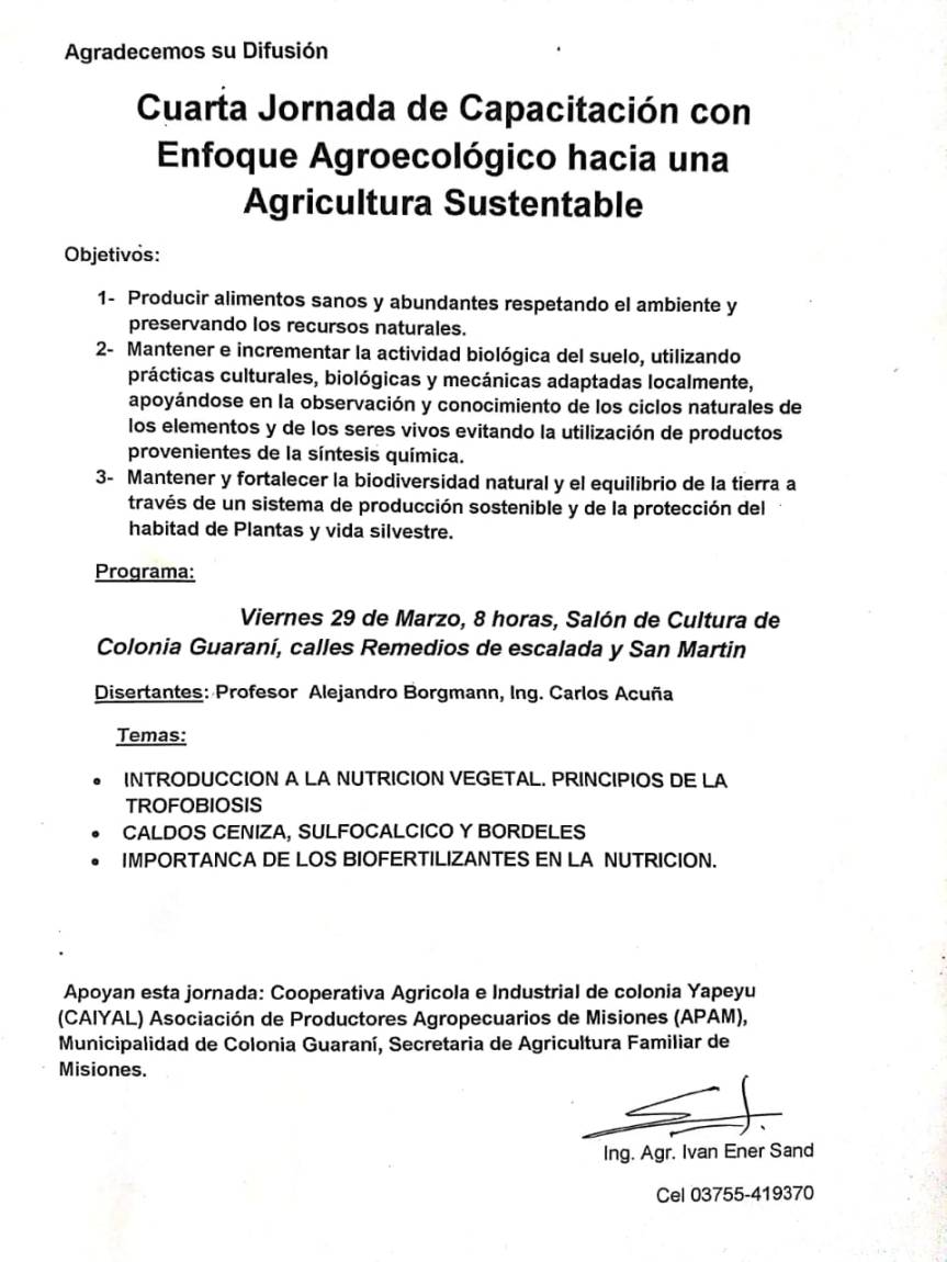 GUARANI. Se llevará a cabo la cuarta jornada de Capacitación «con Enfoque Agroecológico hacia una Agricultura Sustentable». Será en el salón de cultura de Guaraní.