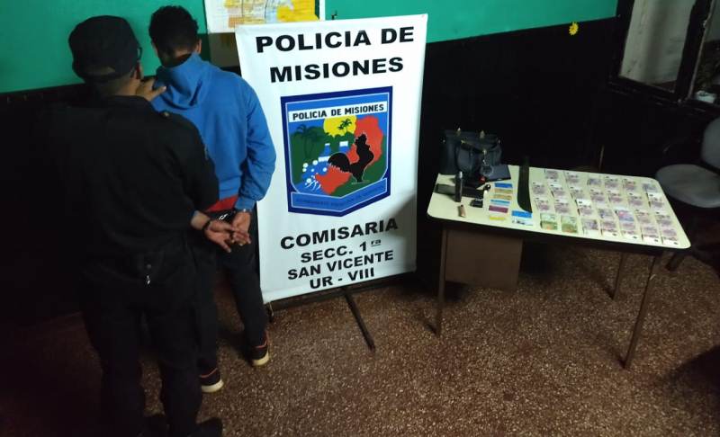 SAN VICENTE. Esta madrugada en el marco de recorridas de prevención sobre la Av. Constitución, fue detenido Javier D.S (25) quien tenía en su poder 1 billetera con la suma de $3500, documentos y tarjetas, 1 cartera con perfumes y pulseras, 1 medidor de glucosa y 1 machete, objetos de los que no puedo precisar su procedencia.
