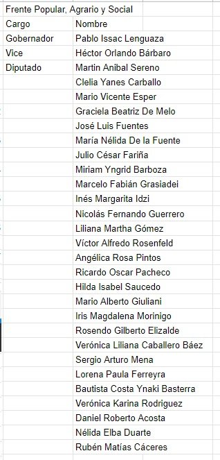 El Frente Popular, Agrario y Social, nomina a Isaac Lenguaza y Héctor “Cacho” Bárbaro como gobernador y vice, mientras que como diputados aparecen Martin Anibal Sereno, por la reelección, Clelia Yanes Carballo, Mario Vicente Esper, Graciela Beatriz De Melo, José Luis Fuentes y María Nélida De la Fuente.