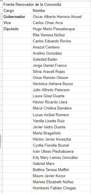 El Frente Renovador de la Concordia inscribió a Oscar Herrera Ahuad como candidato a gobernador y Carlos Arce como vice, junto a Hugo Passalacqua como candidato a primer diputado provincial. En segundo lugar anotó a la joven abogada Rita Núñez y después al actual presidente de la Legislatura, Carlos Rovira. En cuarto lugar, una sorpresa, la abogada Anazul Centeno y quinto, el intendente Avelino González.