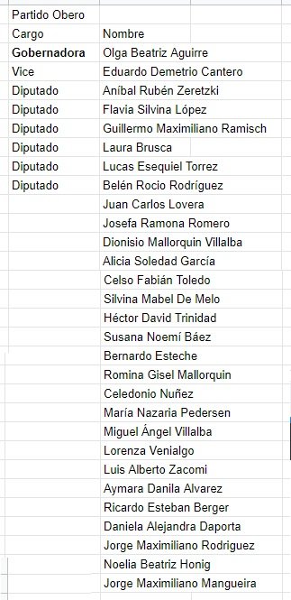 Finalmente, el partido Obrero presenta a Olga Beatriz Aguirre y Eduardo Demetrio Cantero en la fórmula de gobernador y vice, junto a Aníbal Rubén Zeretzki, Flavia Silvina López, Guillermo Maximiliano Ramisch, Laura Brusca y Lucas Esequiel Torrez. Como ya pasó en Posadas, la lista de los trabajadores tiene mayoría de mujeres, lo que puede llegar a ser objetado por el Tribunal, ya que rige la ley de paridad de género.