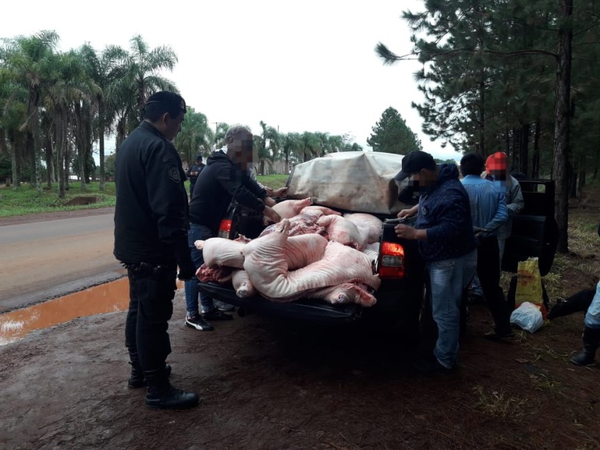 Efectivos de la división Patrulla Motorizada en conjunto con el Comando Radioeléctrico Norte, Seguridad Vial, Toxicomania y el personal de la Dirección de Saneamiento Ambiental de la Municipalidad de Oberá, decomisaron 14 medias reses de carne porcina equivalente a 500 kilogramos y dos botellas conteniendo sangre, presumiblemente de los animales mencionados, que eran transportados en un vehículo al mando de Carlos G. de 49 años, desde la localidad de Alba Posse.
