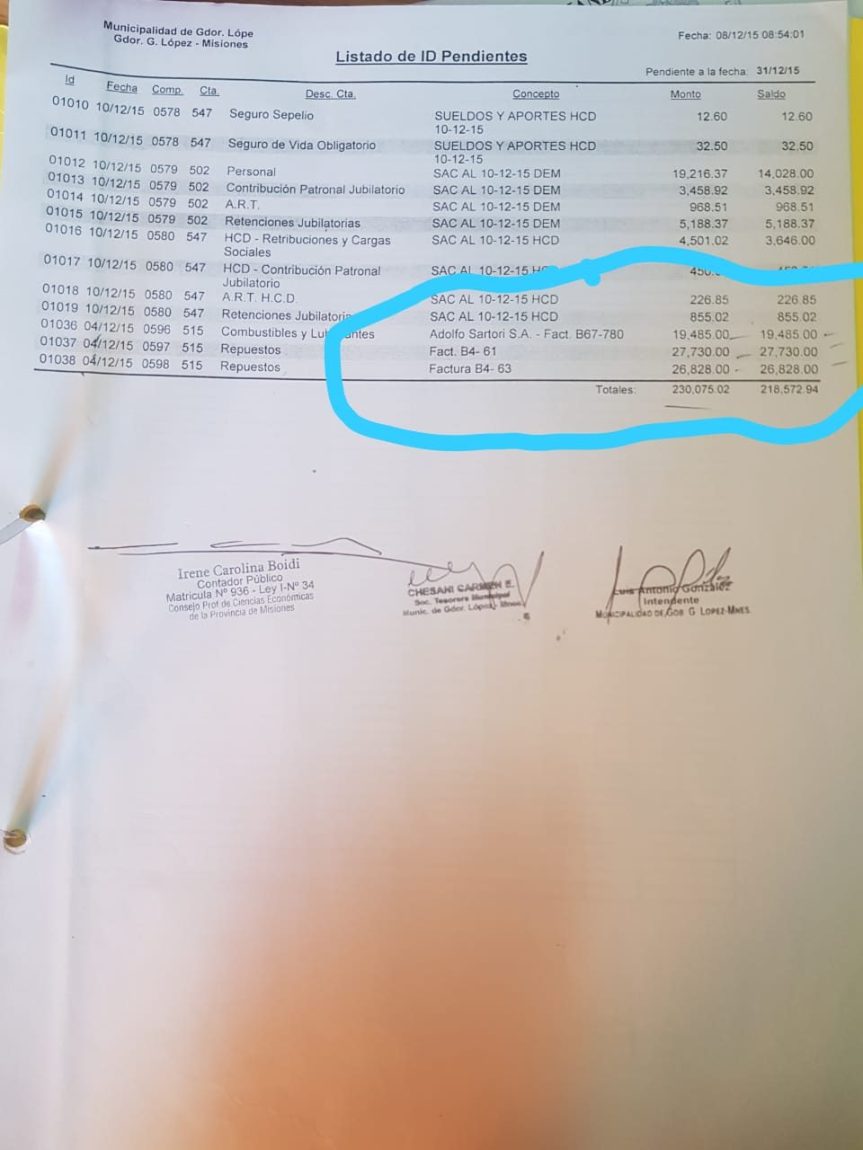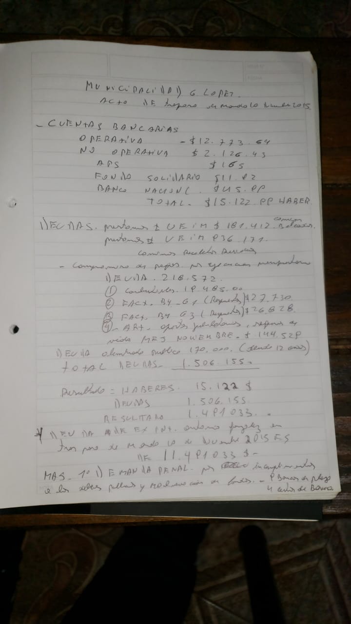 Esta deuda alcanza en un total de 1.506.155 pesos, teniendo como resultados con haberes, cuentas operativas y no operativas un haber de 15.122 pesos con un total final de 1.491.033 de deudas en el municipio de Gobernador López.