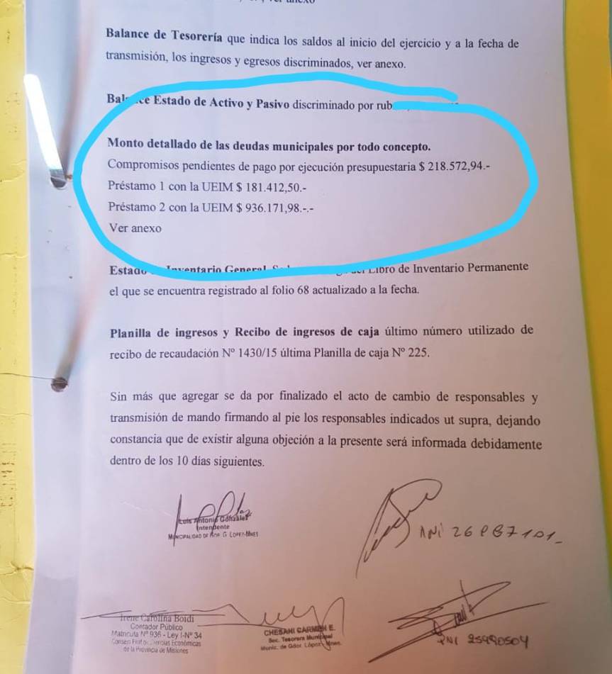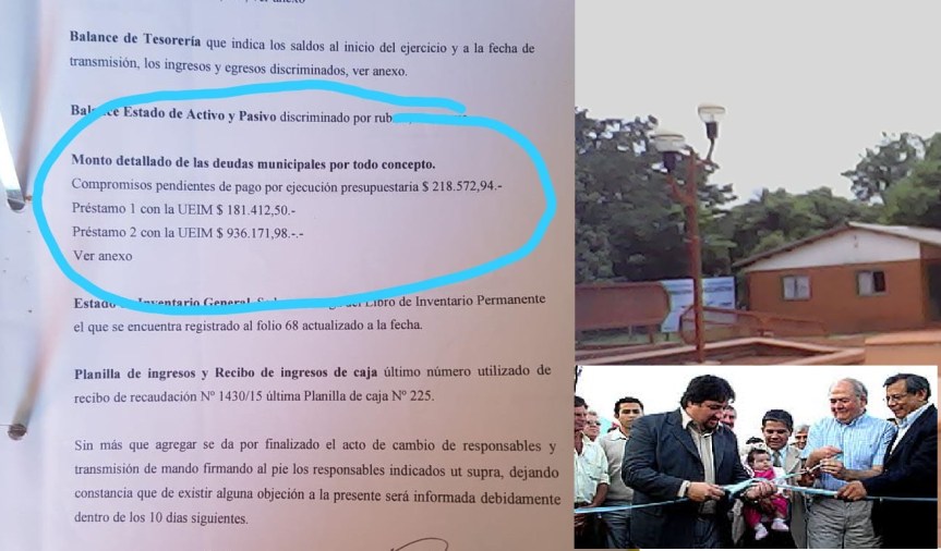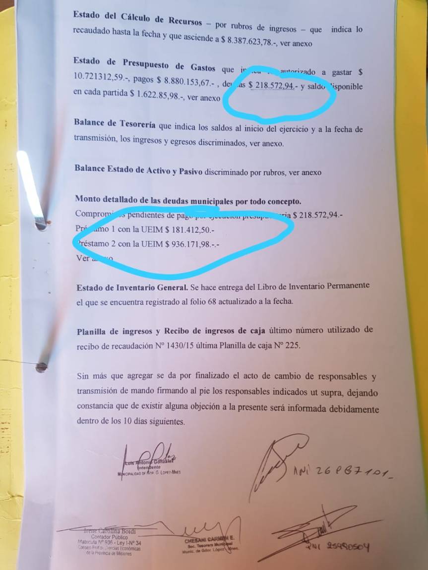 González en toda su gestión no pagaba el alumbrado público dejando así una deuda de 12 años con un total de 170.000 pesos; préstamo 1: UEIM 936.171 pesos; prestamos 2: 181.412 pesos, compromisos de pago por ejecución presupuestaria 218.552 pesos, combustible 19.435 pesos, repuestos 53.000 pesos, ART 144.529 pesos.