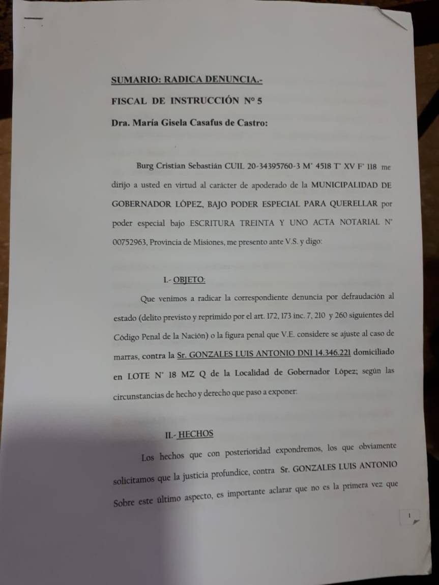 GOBERNADOR LOPEZ. Hace pocos días le actual intendente Sergio Kupczyczyn realizó la presentación contra su atendedor Antonio González.