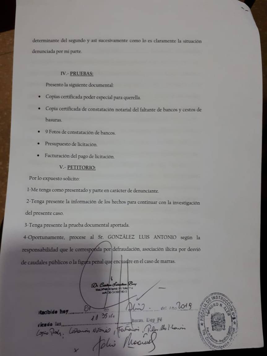 Kupczyczyn presentó en la justicia el presupuesto de licitación, constataciones de faltantes y toda la facturación correspondiente del pago de la licitación de esta obra.