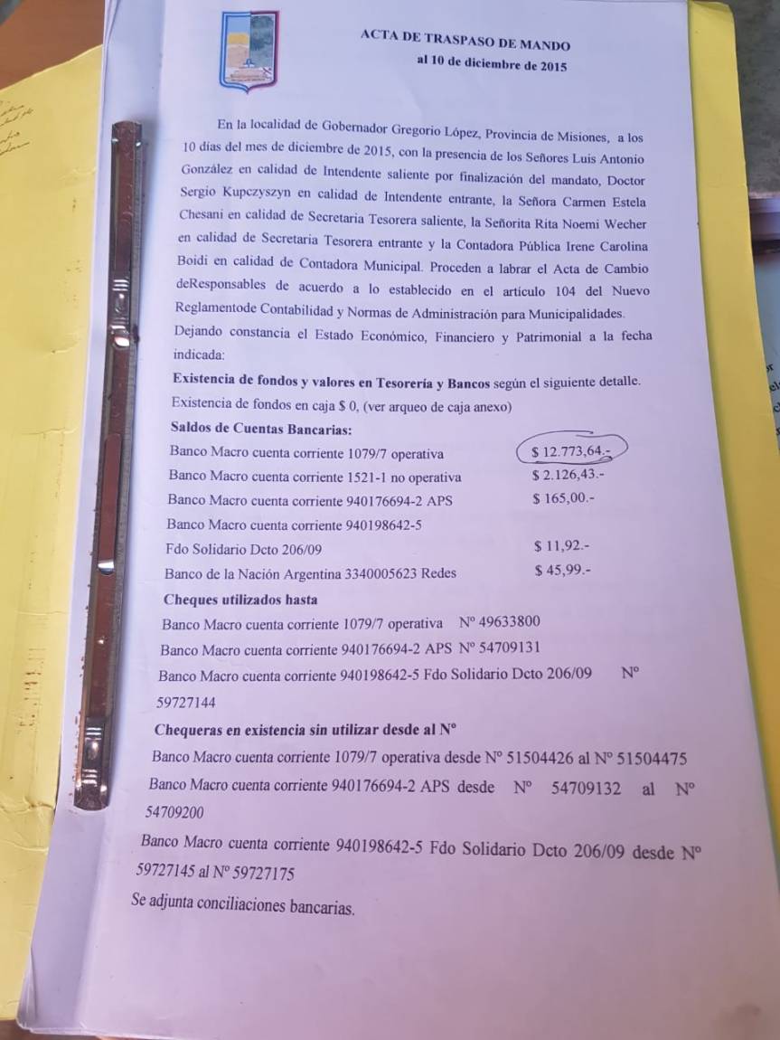 Por otra parte, vale decir que el ex intendente Antonio González entregó el mando en el año 2015 con las arcas del municipio prácticamente vacía con un margen en la cuenta operativa de 12.773 pesos.