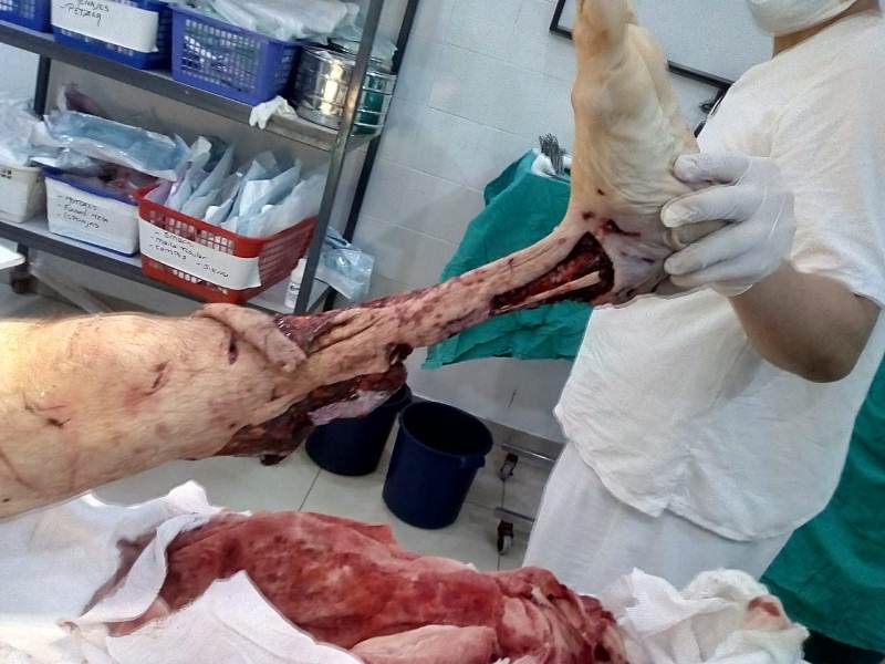 Se solicitó la presencia de una ambulancia, que trasladó al muchacho –en absoluto estado de shock– a un centro médico de la zona donde debieron practicarle sendas intervenciones quirúrgicas para salvarle lo poco que le quedaba de su pierna izquierda y de su brazo derecho, y cerrarle la herida provocada por un mordisco en su cabeza, que le extirpó una de sus orejas.