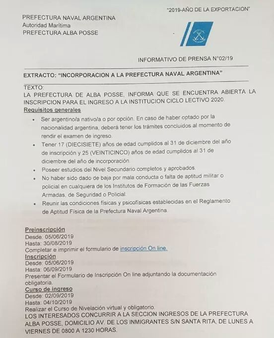 «Prefectura de Alba Posse informa que se encuentran abiertas la inscripciones para el ingreso a la institución ciclo electivo 2020.