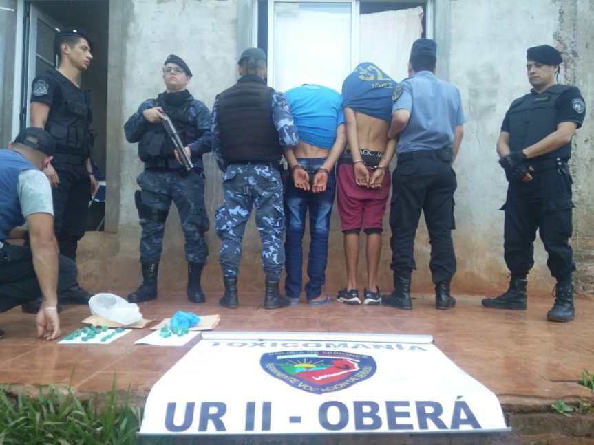 OBERÁ. El lunes, en un domicilio de calle Sapucay, conforme oficio de Fiscalía Federal de Oberá, con intervención del Juzgado de Instrucción 2; personal dependiente de la fuerza provincial detuvo a Hugo B. de 27 años, Marcos C. de 19, ambos con pedido de detención por hechos de robo y robo calificado; secuestraron, cuchillos, 28 envoltorios de marihuana, 2 balanzas de precisión, 1 teléfono celular y gran cantidad de insumos.
