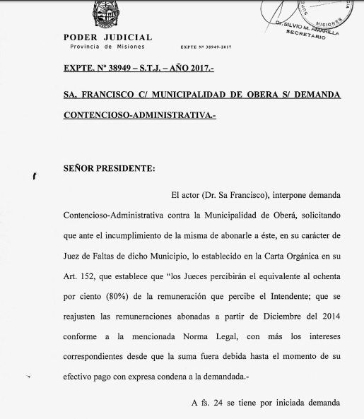 En junio pasado, el Superior Tribunal de Justicia dio lugar a la demanda expediente 38 949/2017 con fecha de 19 de ese mes, realizada por el Juez de Faltas, Francisco Sá, al municipio por el reclamo sobre el cumplimiento del artículo 152 de la Carta Orgánica respecto a su salario. Para el municipio es una cuestión de interpretación y dado que el artículo no está reglamentado por ordenanza, y siendo una norma programática, no es posible saber si se está cumpliendo o no, por lo tanto consideran que jurídicamente Sá no tiene elementos suficientes.
