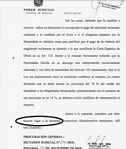Semanas atrás, se dio a conocer el dictamen elevado al Superior Tribunal de Justicia de la provincia, por parte del Procurador General Miguel Angel Piñeiro con fecha de diciembre último a favor del juez de Faltas, Francisco Sá, contra la municipalidad de Oberá debido a una liquidación de sueldos que considera incorrecta. El dictamen concluye “considero que debe hacerse lugar a la demanda contenciosa administrativa interpuesta”.