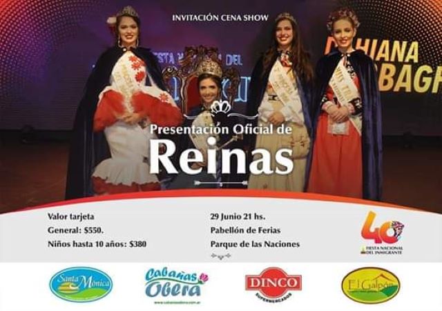 OBERÁ. A través de un comunicado de prensa, la Federación de Colectividades invita a todos a la cena show Presentación de Reinas, donde se conocerán oficialmente y en sociedad a las 15 candidatas a Reina Nacional del Inmigrante.