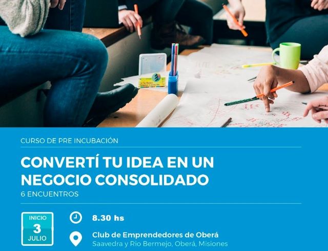 OBERÁ. Este miércoles inicia el curso de Pre Incubación en el Club de Emprendedores de Oberá. Son 6 encuentros que durarán 4h cada uno. El segundo encuentro será el 10, el tercero el 17 y el cuarto el 24, el quinto 31 de julio, y el sexto será 6 de agosto del corriente. Los mismos serán en el horario 8.30 a 12.30