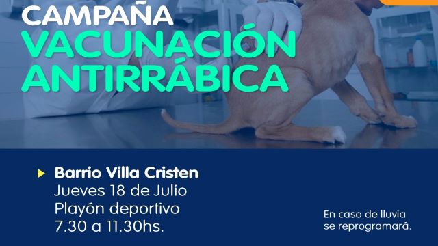 OBERÁ. El departamento de Salud Animal Municipal, a través del área de prensa comunica a los vecinos de Villa Cristen (Playón deportivo) que mañana jueves a partir de las 7.30 hasta las 11.30, estarán realizando la aplicación de la vacuna antirrábica y desparasitación canina y felina.