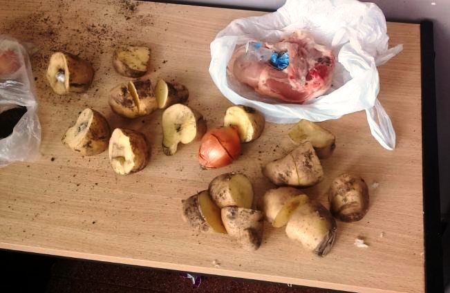 .Consecuentemente, éste solicitó dejar mercaderías, mas precisamente alimentos, por lo que se da aviso al personal de requisa para que proceda con el control pertinente, momento en el que se pone nervioso y comienza a cortar las papas por la mitad. Luego aduce sentirse descompuesto e inmediatamente se dirige al baño.