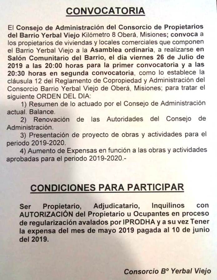 OBERÁ. Este viernes se realizará la Asamblea General Ordinaria del Consorcio del Barrio Yerbal Viejo. Hasta el momento, participa una lista única para la Comisión Directiva que pertenece al mismo grupo de la actual conducción de Horacio Barúa. Además se aprobará Memoria y Balance, presentación de proyectos y se tratará el aumento en las expensas que pasarán de 200 a «300 o 400 pesos», según anticipó el presidente actual en medios radiales.