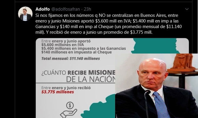 Los dichos surgen ante la publicación que realizó Adolfo Safrán, ministro de Hacienda de Misiones: “si nos fijamos en los números que NO se centralizan en Buenos Aires, entre enero y junio Misiones aportó 5.600 millones de pesos en IVA; 5.400 millones de pesos en Impuesto a las Ganancias y 140 millones de pesos en Impuesto al Cheque (un promedio mensual de 11.140 millones de pesos). Y recibió de enero a junio un promedio de 3.775 millones de pesos”; y también expresó: «no todos los misioneros defendemos a nuestra provincia. Algunos diputados de la UCR-Juntos por el Cambio creen que #Misiones ya recibe lo que merece y que no vale el esfuerzo reclamar los recursos que el Gobierno Nacional nos debe».