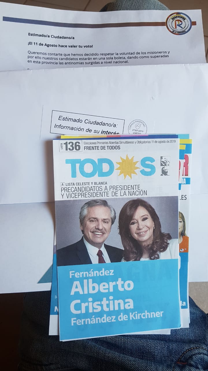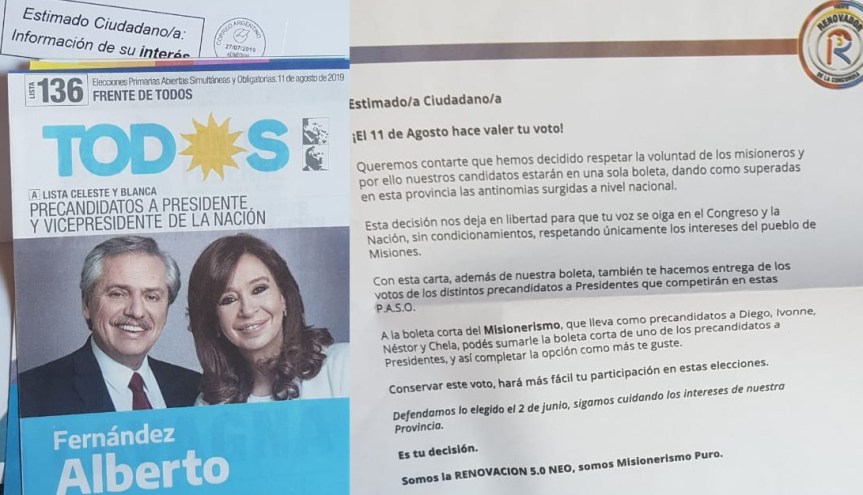 Debido a esto y que la justicia todavía no se expidió respecto a autorizar la boleta individual para la categoría de Presidente de la Nación; vecinos de diferentes barrios (y probablemente se replique en otros municipios), están recibiendo vía correo postal (con Correo Argentino cuya estampilla mínima cuesta 65 pesos) en sus domicilios, «boletas cortas del misionerismo» con los candidatos a diputados del Frente Renovador y, tres boletas individuales postulando para presidente de la Nación a Alberto Fernández y Cristina Fernández / Mauricio Macri – Miguel Angel Picheto / Roberto Lavagna – Juan Manuel Urtubey.