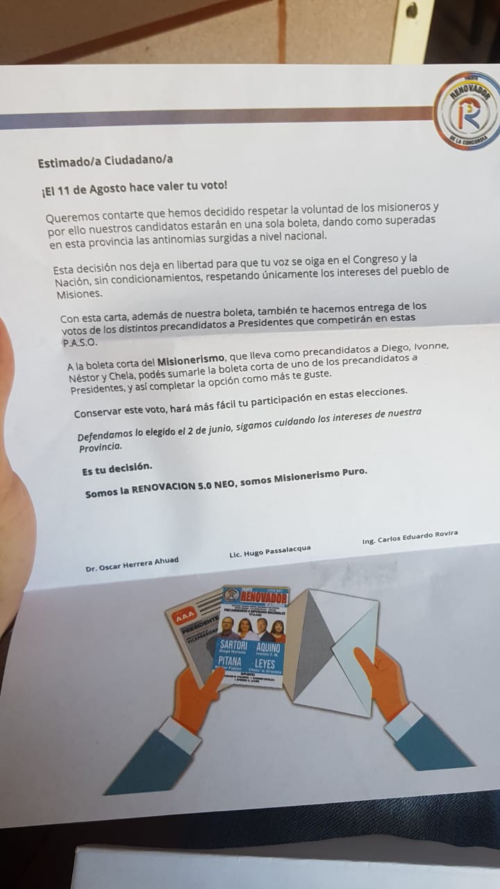 A cada vivienda llegan tres cartas, y junto a los votos, se acompaña una misiva argumentado textualmente que «hemos decidido respetar la voluntad del misionero y por ello nuestros candidatos estarán en una sola boleta dando como superadas en esta provincia las antinomias surgidas a nivel nacional».