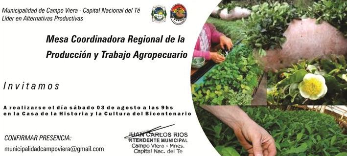CAMPO VIERA. Este sábado 03 de agosto desde las 09hs se reúne la Mesa Coordinadora Regional de la Producción y Trabajo Agropecuario. Tendrá lugar en la casa de la historia y la cultura del bicentenario en la Capital Tealera asistirán autoridades y referentes del sector.