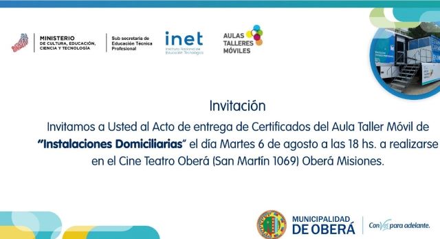 OBERÁ. Se cumplirá una nueva entrega de certificados a los participantes de los cursos de instaladores domiciliarios. Será el martes 6 a partir de las 18hs en el Cine Teatro Oberá.