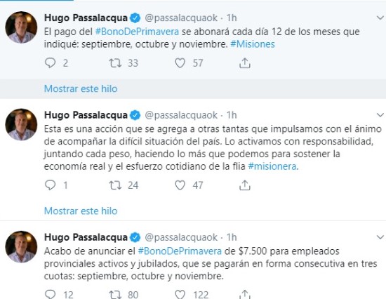 MISIONES. Lo anunció este viernes el gobernador provincial, Hugo Passalaacqua via Twitter. Allí aseguró que se dará un “Bono Primavera” de 7.500 pesos que se pagará de modo consecutivo el 12 de septiembre, el 12 deoctubre y el 12 de noviembre, a todos los empleados públicos activos y pasivos.