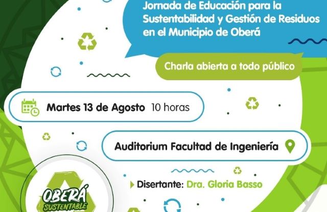 OBERÁ. Desde prensa de la Municipalidad informan que la dirección de Saneamiento Ambiental invita a la comunidad a participar en la Jornada de Educación para la sustentabilidad y Gestión de Residuos Sólidos Urbanos en el Municipio de Oberá. La charla será dictada por la especialista en el tema Dra. Gloria Basso en el auditórium de la facultad de Ingeniería el próximo martes 13 de agosto a las 10hs.