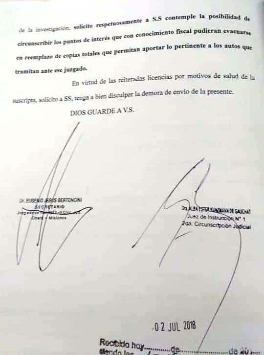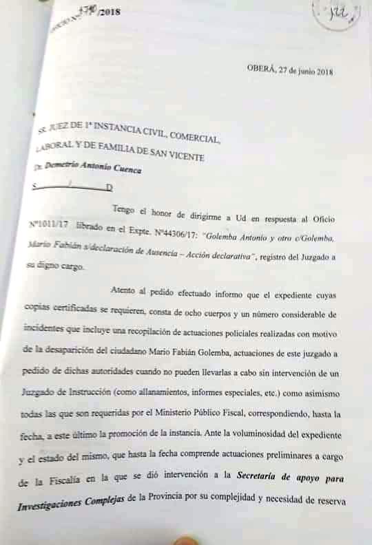 En su diligencia, aprovechando unos efímeros días de vacaciones (ya que vive en Resistencia, Chaco) Eliezer Golemba acudió además al Juzgado de 1º Instancia en lo Civil, Comercial, laboral y de Familia de San Vicente, donde se tramita una segunda causa judicial (Expediente 44306/2017 “Golemba Antonio s/ Declaración de Ausencia –Acción Declarativa”). Allí se reunió con el juez Demetrio Cuenca, quien le exhibió documentación relativa a un pedido que este magistrado hiciera a la jueza Gauchat solicitándole también acceso al expediente por la causa de desaparición . Este pedido fue realizado en 2017 pero también fue denegado por la jueza Gauchat, quien esa esa ocasión adujo un problema de “voluminosidad”.