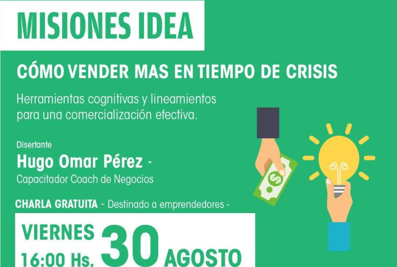 POSADAS. Misiones Idea junto al Polo TIC invitan a la charla: “Cómo vender más en tiempos de crisis”, el próximo viernes 30 de agosto a las 16 Hs. Destinad a emprendedores y al público en general, se busca compartir experiencias y contenidos aplicables en los emprendimientos con el fin de fortalecer al sector.
