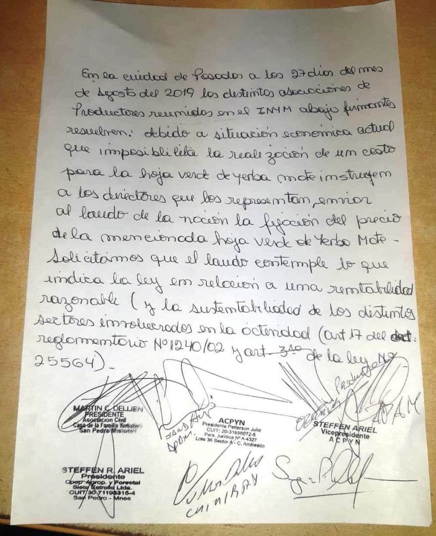 En la misma, se fundamenta que «debido a la situación económica actual que imposibilita la realización de un costo para la la hoja verde de yerba mate, instruyen a los directores que los representa, enviar a laudo de la Nación la fijación del precio», apelando a que prime el criterio de rentabilidad razonable, en el organismo nacional.