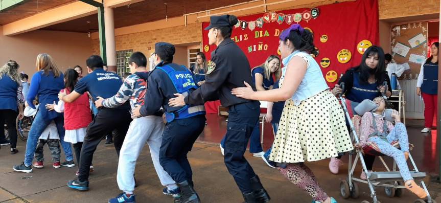 La asistencia fue perfecta a la jornada donde la Policía sorprendió a sus ahijados con una peculiar visita por el día del Niño a la Institución Escolar a la que desde hace varios años se encuentra apadrinando. Pero la persona que se llevó los aplausos y las sonrisas de los más chicos fue la Oficial Subayudante Sol Moreira quien bajo un disfraz de «PAYAPOLICIA» alegro la jornada, donde profesionales de la División Comunitaria y Comisarías locales le dieron brillo y una especial atención a los agasajados.