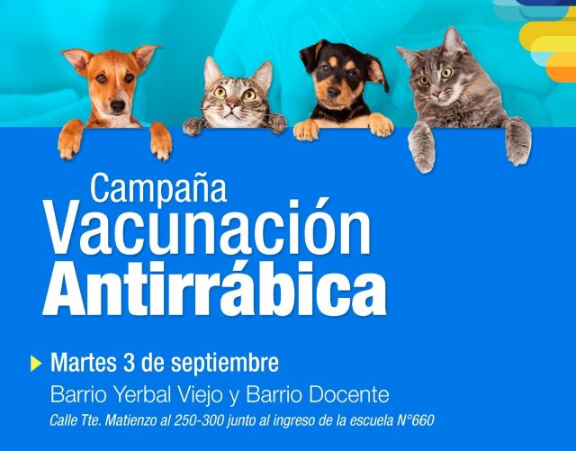 OBERÁ. El departamento de Salud Animal Municipal, estará realizando la aplicación de la vacuna antirrábica y desparasitación a perros y gatos, este martes a mascotas de los barrios Yerbal Viejo y Docente, el puesto estará ubicado en calle Tte. Matienzo de 7.30 a 11.30