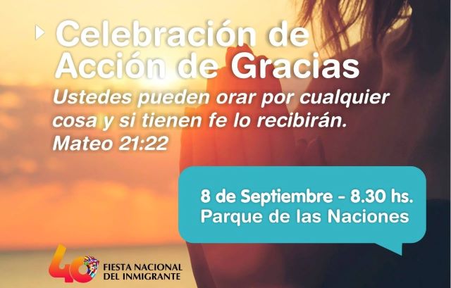 OBERÁ. El próximo domingo 8 de septiembre, se llevará adelante la celebración de Acción de Gracias en el marco de la XL Fiesta Nacional del Inmigrante, será a partir de las 8.30 en el Parque de las Naciones.