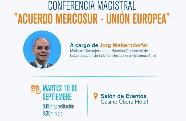 OBERÁ. Esta jornada estará a cargo del Dr. Jorg Weberndorfer quien es Ministro Consejero de la Sección Comercial de la Delegación de la Unión Europea en Buenos Aires. Será el próximo martes 10 de septiembre en el salón de eventos del Casino Hotel, a partir de las 8 de la mañana y media hora más tarde el inicio de la conferencia.