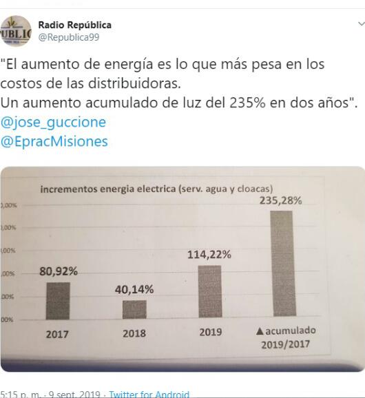 Es por ello que el titular del ente, José Guccione, en diálogo con Radio República, expresó que el motivo principal es el aumento de los costos, citó como ejemplo el del servicio eléctrico de las centrales que aumentó casi un 200% en los últimos dos años. Este sería el segundo aumento del año, ya que en junio se había dado un incremento del mismo porcentaje.