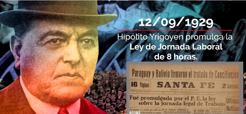 EFEMÉRIDES. Tras ser tratada y aprobada por el Congreso de la Nación el 29 de agosto de 1929, el Poder Ejecutivo Nacional promulga la ley 11.544 por la cual se fija la jornada laboral de un máximo de ocho horas diarias y cuarenta y ocho semanales para todos los trabajadores. Esta ley junto a las de organización gremial, contrato colectivo de trabajo, descanso dominical, seguro de accidentes de trabajo, salario mínimo, jubilación y la adhesión de la Argentina a las Convenciones Internacionales del Trabajo, formaba parte de una serie de normas y medidas llevadas adelante por el Presidente Hipólito Yrigoyen con vista a mejorar la situación de los trabajadores en su conjunto.