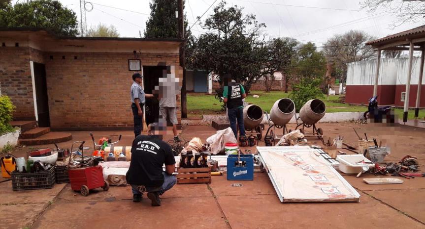 CAMPO VIERA. Tras un pormenorizado trabajo de investigación y pesquisas llevadas adelante por efectivos de las divisiones: Investigaciones; Comando Radioeléctrico Centro, Toxicomanía e Infantería de Oberá, en conjunto con el Comando Radioeléctrico y comisaría de Campo Viera; esta tarde detuvieron a Silvio L. de 35 años, alias “Charico” y recuperaron varios elementos como ser: 4 motosierras, aberturas, herramientas de albañilería, un balde, prolongadores, amoladoras, maquinas mezcladoras, palas, motoguadañas, entre otros.