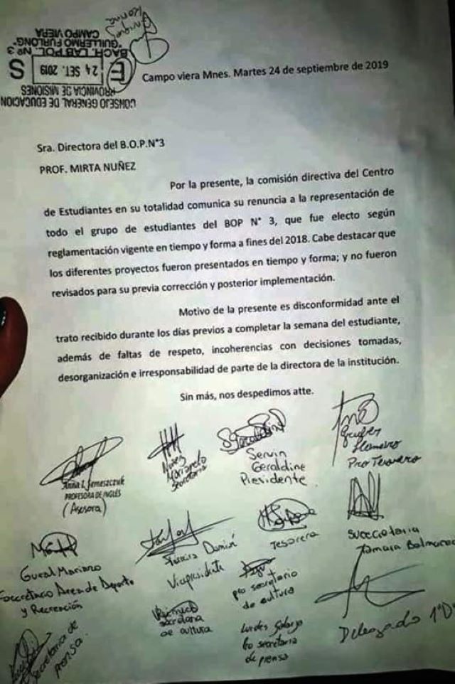 CAMPO VIERA. En la jornada de este martes se conoció una misiva comunicando la renuncia de forma masiva de la totalidad de la conducción del centro de estudiantes del BOP N°3 de la Capital Nacional del Te.