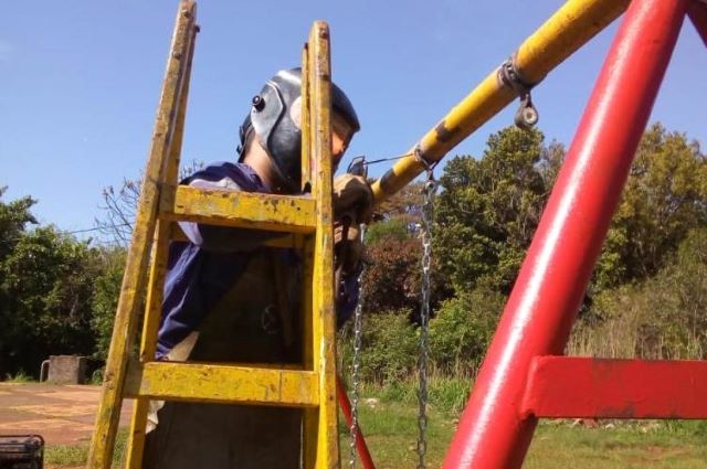 OBERÁ. Agentes de la dirección de Obras Públicas trabajan en mantenimiento y fabricación de juegos infantiles en plazas, plazoletas, parques y paseos de la ciudad.