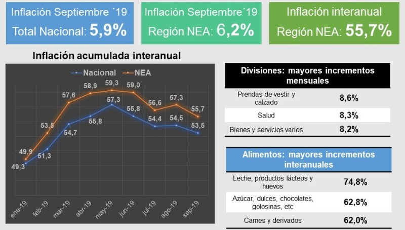 NEA. La inflación en la región del NEA en septiembre de 2019, marcó 6,2%, siendo la más alta del país por segundo mes consecutivo. En ese marco, las prendas de vestir y calzado, y salud son las divisiones donde más crecieron los precios en el mes. En alimentos, los productos lácteos siguen siendo los que más crecieron en el último año, según un informe elaborado por la consultora Politikon Chaco en base a datos de INDEC.
