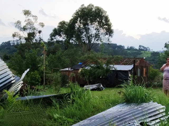 En El Soberbio la policía asistió la vivienda de Alexander Da Rosa (44) quien vive con su esposa y tres hijos menores (ver fotos), según se constató había perdido todo el techo de zinc, cerca de ahí se observó un poste de luz caído y árboles, por suerte no se registraron otros afectados ni lesionados. (San Vicente Informa)