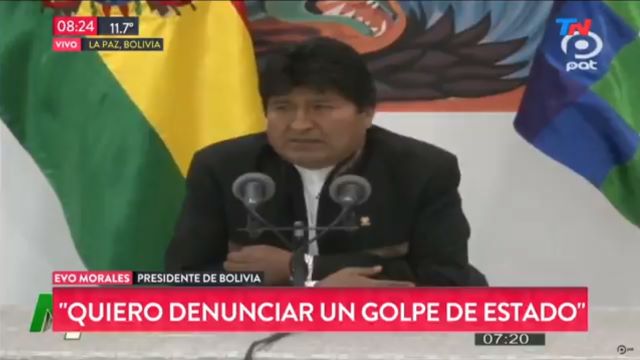 «Está en proceso un golpe de estado, quiero que sepa el pueblo boliviano, que hasta ahora humildemente soportamos para evitar violencia y no hemos entrado en confrontación», afirmó el mandatario en una declaración a la prensa. Morales apareció ante los medios por primera vez desde los comicios del domingo y dio declaraciones en momentos en que comienza una huelga nacional que reclama una segunda vuelta con el opositor Carlos Mesa.