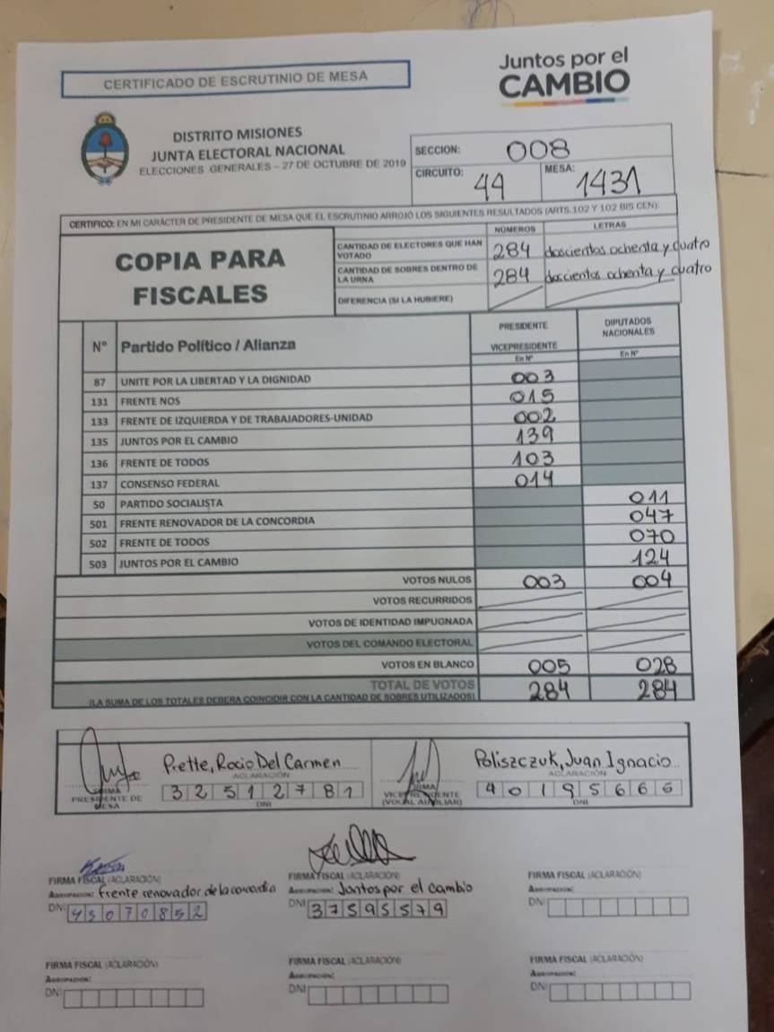 OBERÁ. En el departamento votaron 76.905 personas de 90.158 habilitadas, arrojando un porcentaje del 85. Según los datos aportados por fiscales de las planillas del escrutinio provisorio, el frente Juntos por el Cambio, habría logrado revertir el resultado tanto a presidente de la nación como a diputados nacionales.