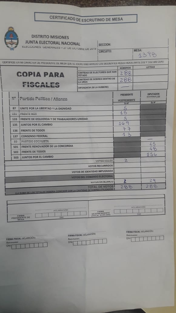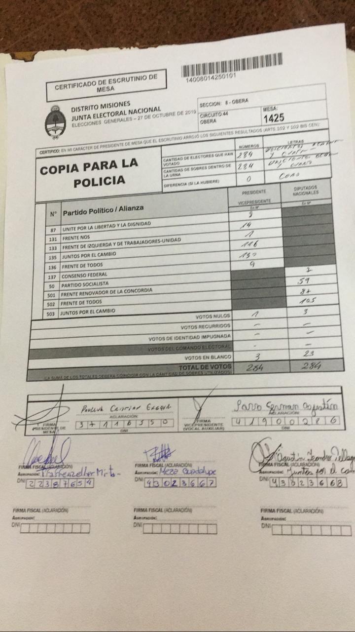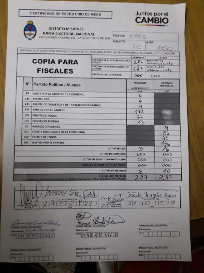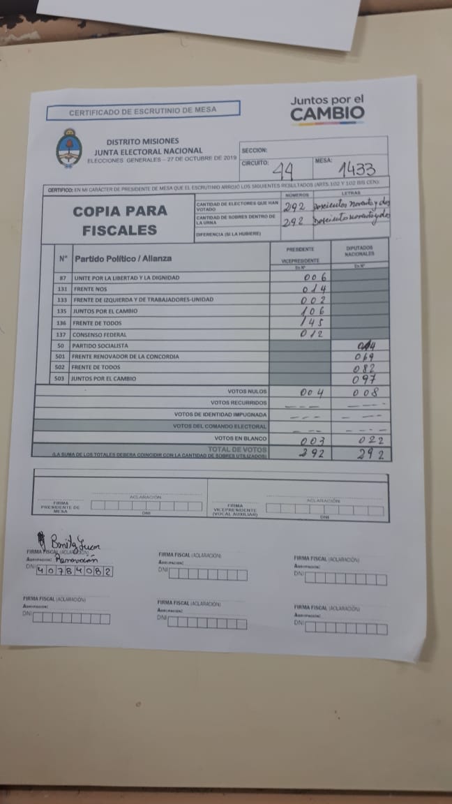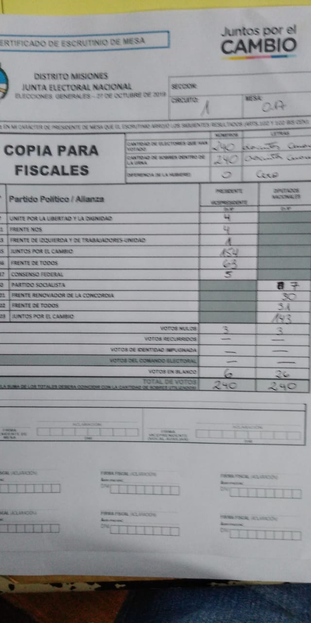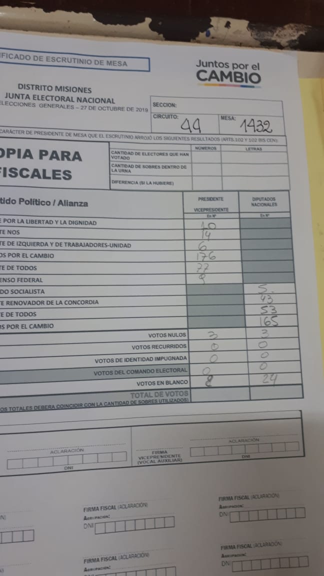 OBERÁ. En el departamento votaron 76.905 personas de 90.158 habilitadas, arrojando un porcentaje del 85. Según los datos aportados por fiscales de las planillas del escrutinio provisorio, el frente Juntos por el Cambio, habría logrado revertir el resultado tanto a presidente de la nación como a diputados nacionales.