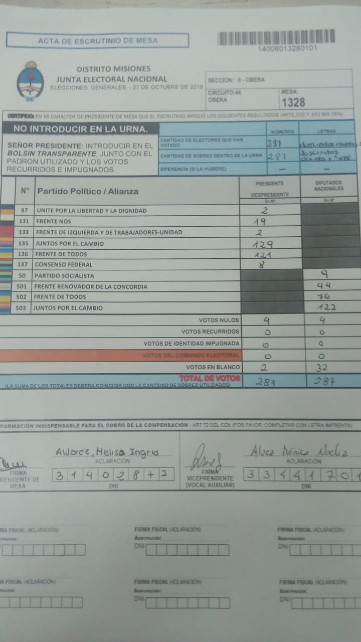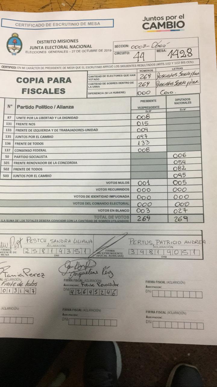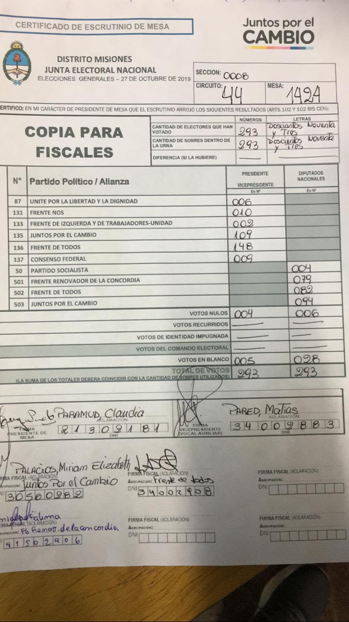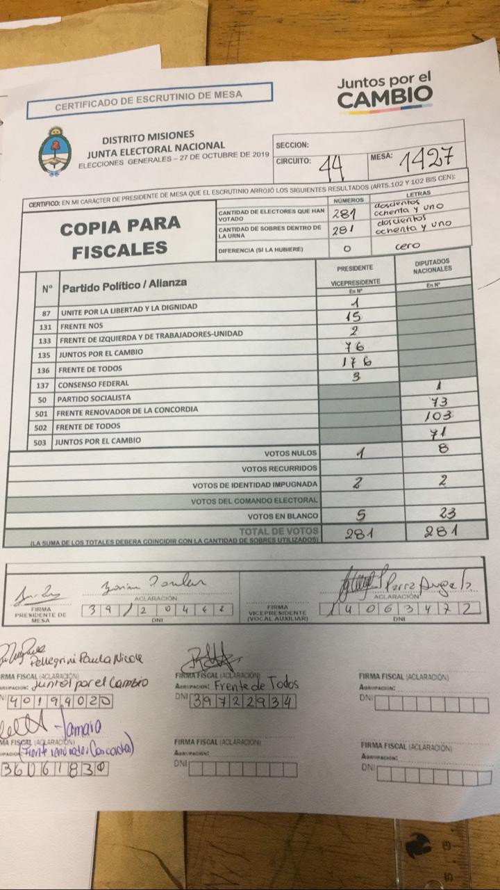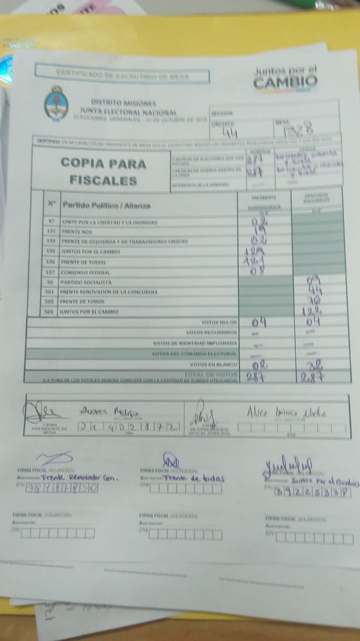 OBERÁ. En el departamento votaron 76.905 personas de 90.158 habilitadas, arrojando un porcentaje del 85. Según los datos aportados por fiscales de las planillas del escrutinio provisorio, el frente Juntos por el Cambio, habría logrado revertir el resultado tanto a presidente de la nación como a diputados nacionales.