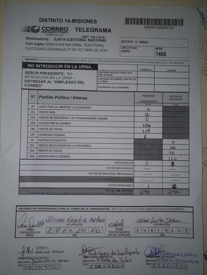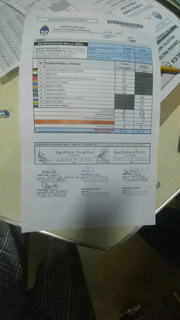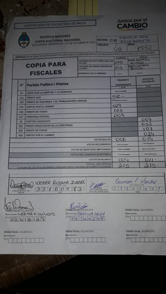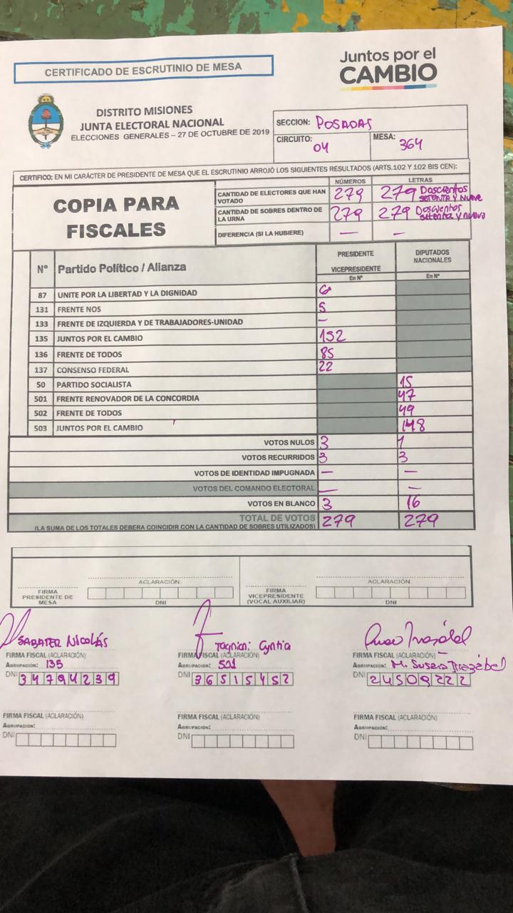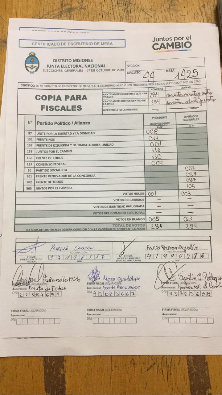 OBERÁ. En el departamento votaron 76.905 personas de 90.158 habilitadas, arrojando un porcentaje del 85. Según los datos aportados por fiscales de las planillas del escrutinio provisorio, el frente Juntos por el Cambio, habría logrado revertir el resultado tanto a presidente de la nación como a diputados nacionales.